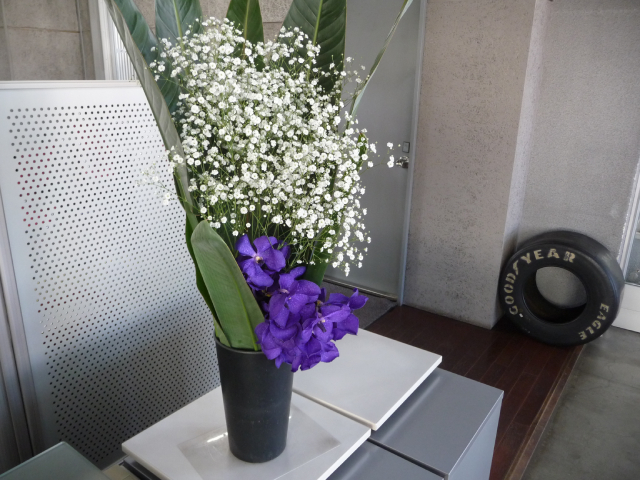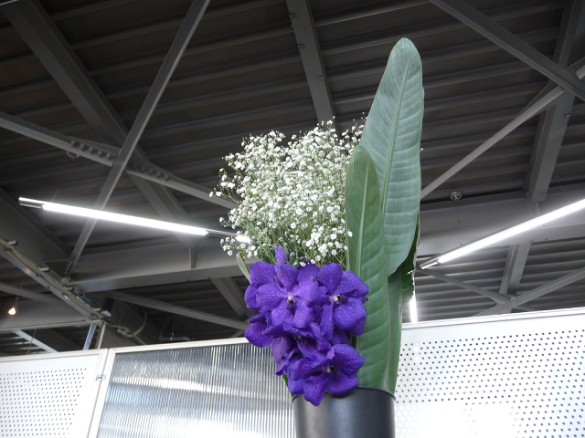 バンダ蘭、カスミ草、ストレチアの葉。